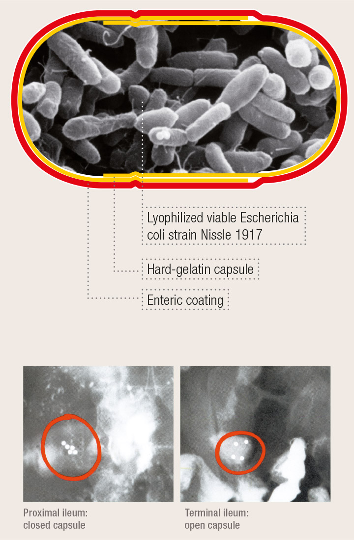 These capsules possess an enteric coating. They only open in the terminal ileum or at the beginning of the colon where they release the active substance.